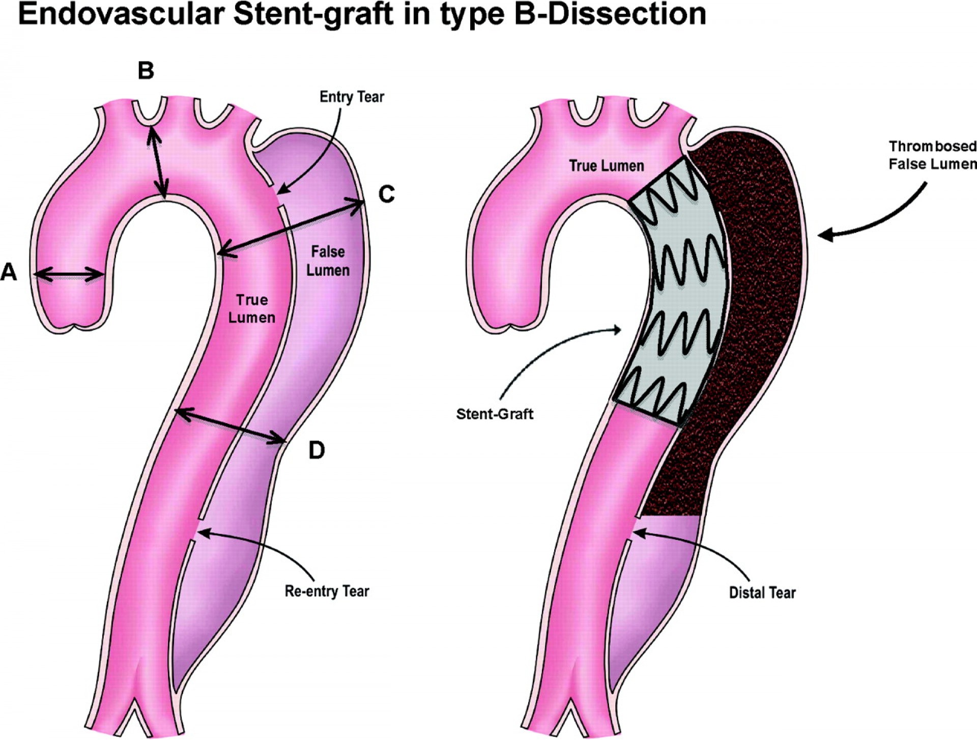 Παρατηρείστε την θέση του stent στο σημείο εισόδου του αίματος μέσα στο αορτικό τοίχωμα. Το stent κλείνει αυτό το σημείο εισόδου που οδηγεί την ροή του αίματος στο αορτικό τοίχωμα, καταστρέφοντάς το.